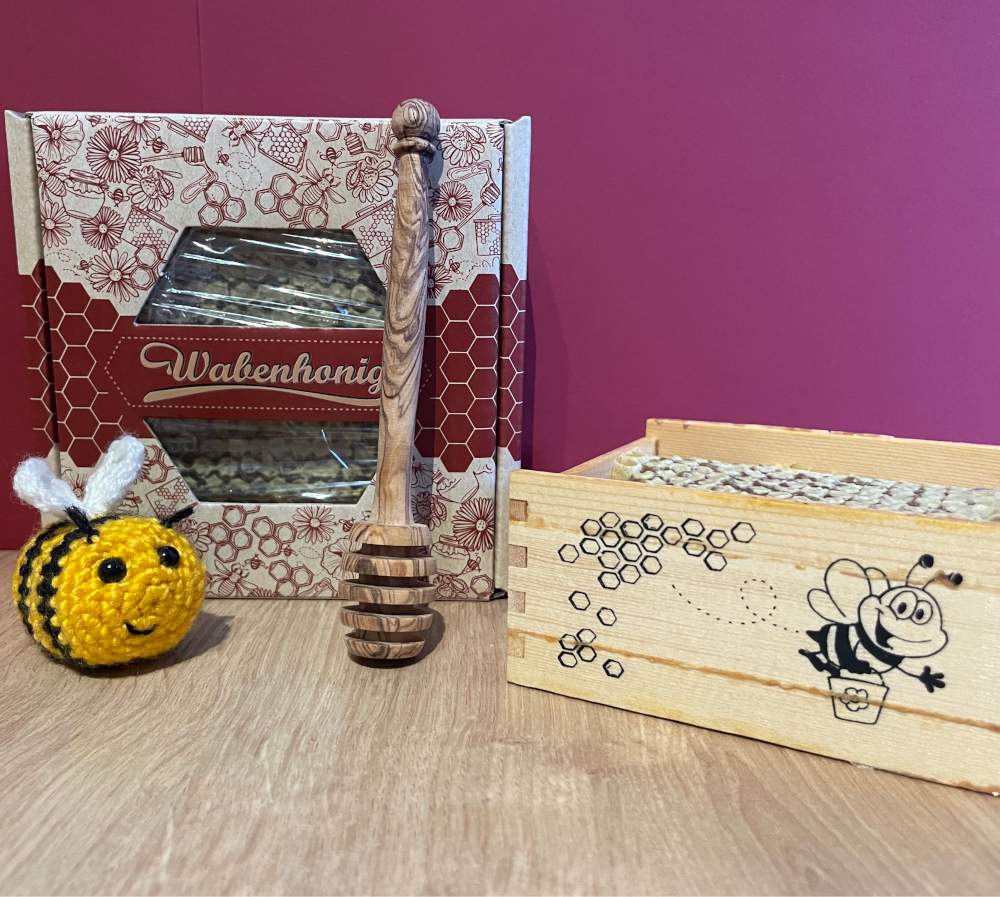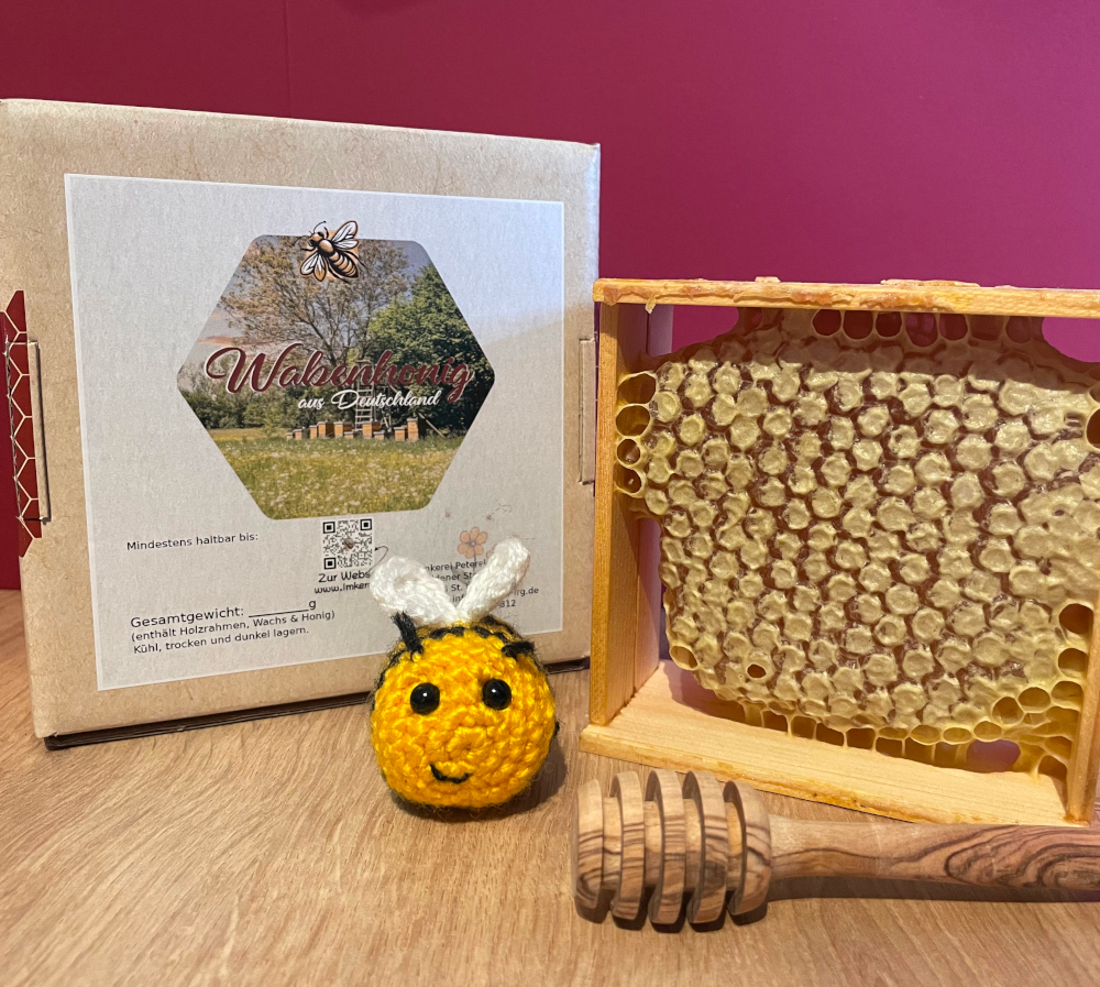 Die perfekte Geschenkidee: Unser Wabenhonig wird in einer ansprechenden Kartonverpackung und kleinem Holzrähmchen präsentiert und ist somit eine besondere Geschenkidee für Liebhaber natürlicher Produkte.