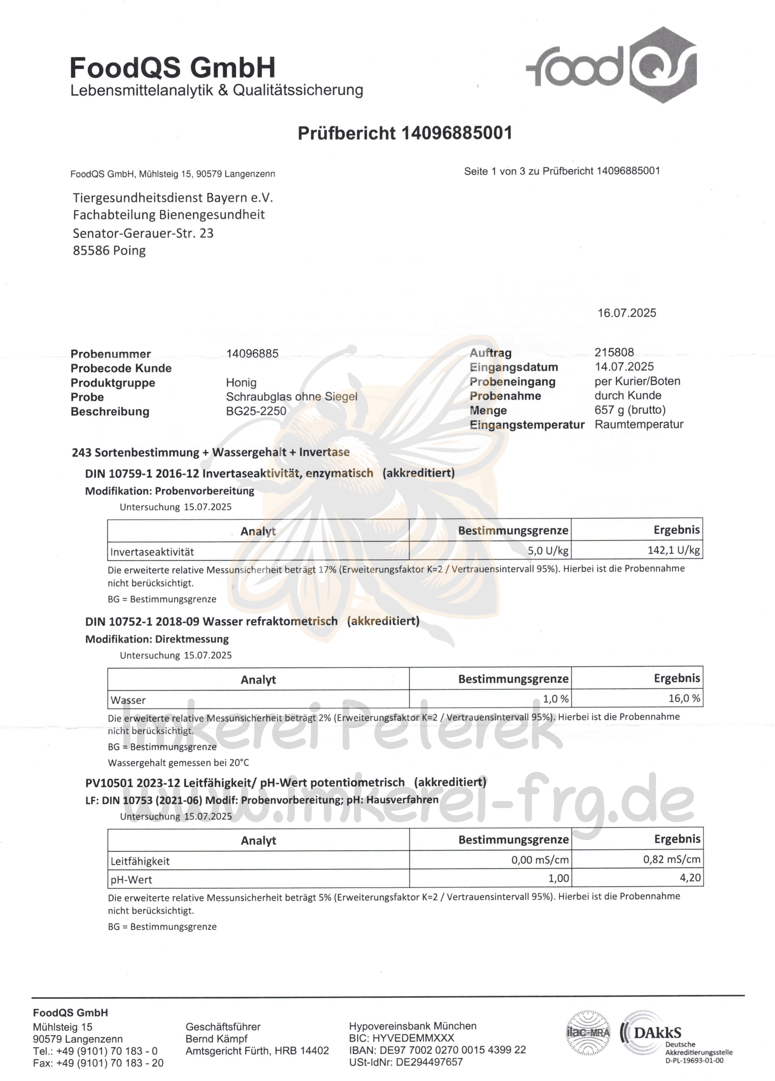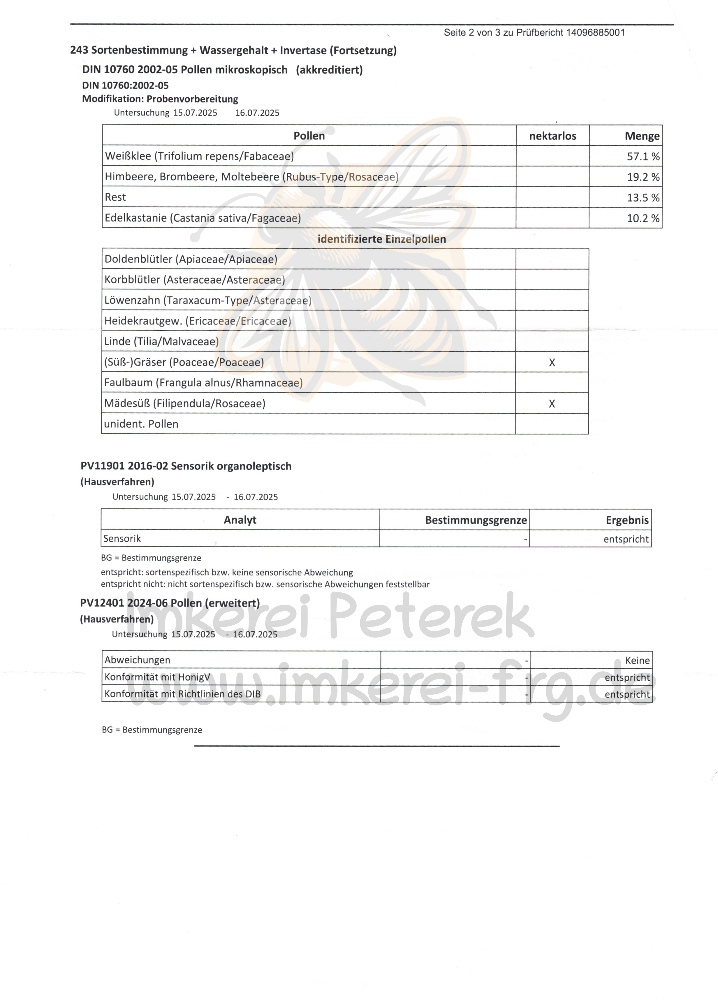 Nach der Schleuderung senden wir unseren Honig an ein Lebensmittel-Labor zur Qualitäts- und Sortenbestimmung. Die Bezeichnung „Waldhonig“ oder „Tannenhonig“ wird durch spezifische Messwerte und sensorische Eigenschaften bestimmt. Ein Waldhonig besteht überwiegend aus Honigtau, der den Bienen während der Sommertracht zur Verfügung steht. Ergänzend können auch Blütenpollen von Pflanzen wie Weißklee, Himbeere, Edelkastanie oder weitere Pflanzen enthalten sein. Entscheidend für die Sortenbestimmung sind der pH-Wert und die Leitfähigkeit. Honigtau weist im Vergleich zu Blütenhonig einen höheren pH-Wert und eine höhere Leitfähigkeit auf. Um als Waldhonig zu gelten, muss die elektrische Leitfähigkeit mindestens 0,80 mS/cm betragen. Tannenhonig muss sogar eine Leitfähigkeit von mindestens 1,10 mS/cm aufweisen. Der pH-Wert liegt bei Honigtauhonig in der Regel zwischen 4,2 und 5,5. Zusätzlich spielen die eher dunklere (rotbraune) Farbe und der Geschmack (malzig-würzig) eine wichtige Rolle bei der Sortenbestimmung.